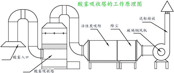 處理方法:由于廢氣中的主要成分為酸性分子,故而其主要的處理方式為酸堿中和反應(yīng),如本公司生產(chǎn)的玻璃鋼酸洗塔,其主要的工作原理就是酸堿中和原理。