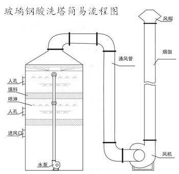 玻璃鋼酸洗塔外部的氣體經(jīng)由玻璃鋼離心式風(fēng)機(jī)以管道之后進(jìn)入塔內(nèi),經(jīng)過(guò)多孔板進(jìn)入填料層,在填料層上有來(lái)自于噴嘴分布下來(lái)的噴淋液體,并且在填料上形成一種液態(tài)膜,氣體流經(jīng)填料空隙時(shí),與填料液膜接觸并進(jìn)行吸收或中和反應(yīng)之后,氣體繼續(xù)向上走,經(jīng)過(guò)幾次吸收或中和后的氣體經(jīng)除霧器收集后,經(jīng)由出風(fēng)口排出塔外。而液膜上的液體則經(jīng)過(guò)液體收集器回收至指定地點(diǎn)。