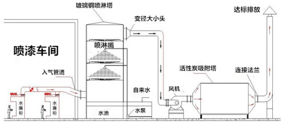a、首先在噴漆車間產(chǎn)生的廢氣經(jīng)由水簾柜初步的過(guò)濾灰塵之后由管道進(jìn)入玻璃鋼噴淋塔內(nèi)。